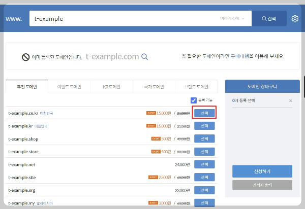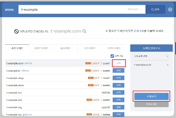 - 특가 도메인의 경우 갱신 시 가격이 비싸질 수 있으니 정가를 확인 후 선택합니다.