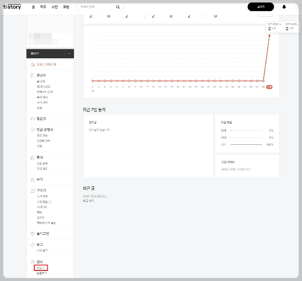 1) 티스토리 블로그 관리 화면에 접속 후 관리 > 블로그 메뉴를 클릭합니다.