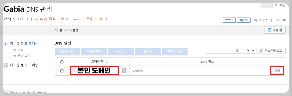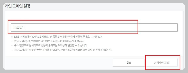 3) Gabia에서 생성한 도메인 명을 입력 후 [변경사항 저장] 버튼을 클릭합니다.