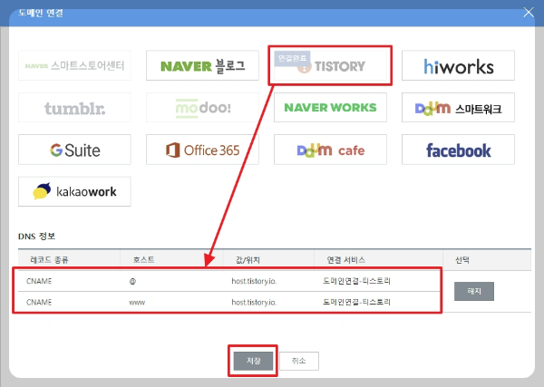 6) [TISTORY] 버튼 클릭 후 DNS 정보에 CNAME 레코드 2개가 생성된 것을 확인 후 [저장] 버튼을 클릭합니다.