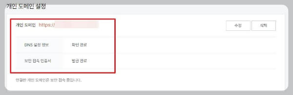 - 휴일, 업무시간 이후에는 시간이 오래 걸릴 수 있으며 3일 정도 지났는데도 발급 완료 상태가 되지 않을 경우 도메인 삭제 후 개인도메인 설정을 재진행해보는 것을 추천합니다.