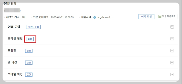 5) DNS 관리 화면에서 도메인 연결 [설정] 버튼을 클릭합니다.